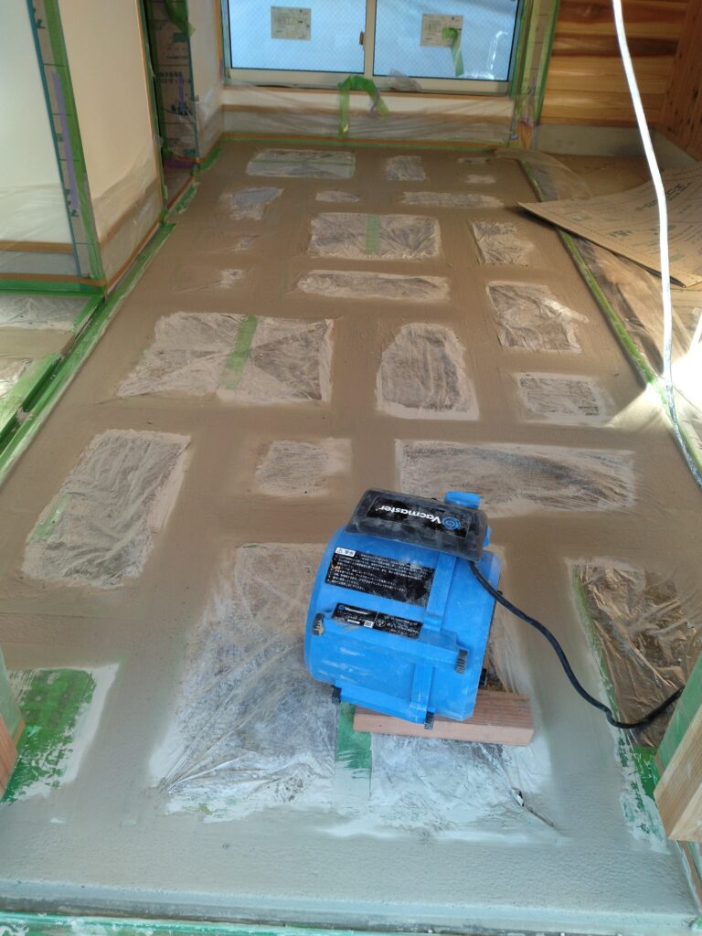 養生しちゃってますが、タイルが貼ってあります。ちなみにこのタイルの施工も弊社でさせていただきました。このタイル養生めっちゃ大変でした。