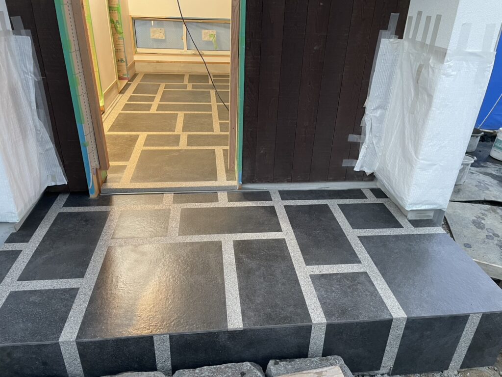 写真を見てもらえるとわかる通り、タイルとタイルの間が幅広くあいてますよね。この間を洗い出しで仕上げるというとてもオリジナリティあふれる仕上げになっております。