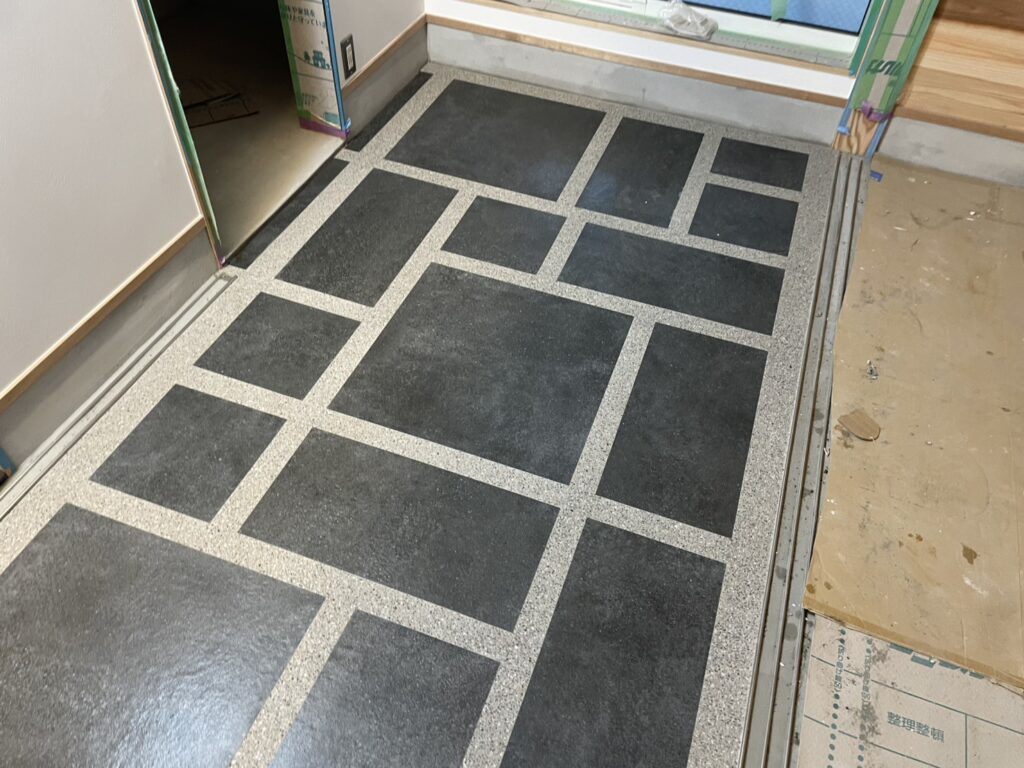 大きなタイルや小さなタイルの間を洗い出しが埋めることでオリジナリティあふれる玄関空間になりました。みんなの注目の的になること間違いなしです。
